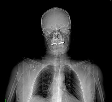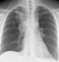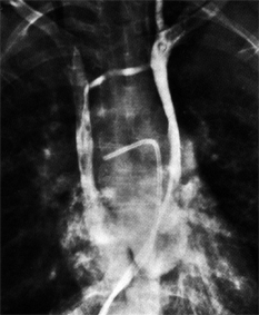 Im Röntgen sieht man den dislozierten Katheter und die Kontrastmittelextravasation ins Mediastinum. Dorthin wurde auch das hochgradig gewebetoxische Adriamycin infundiert.