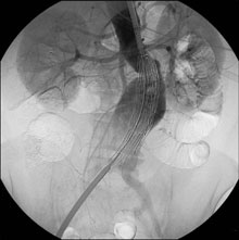 Dann erfolgt eine Angiographie mit Darstellung des Aneurysmas und der Nierenarterien.