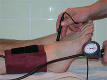 Mit einer Blutdruckmanschette und einem cw-Dopplergerät wird der Verschlußdruck an den Armen und den Knöchelarterien gemessen. Das Verhältnis Knöchelarteriendruck / Armarteriendruck ist ein Maß für den Schweregrad einer Durchblutungsstörung an den Beinen. Werte zwischen 1,2 und 0,9 sind normal.